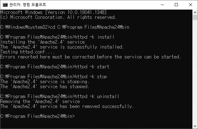 httpd -k uninstall #서비스 제거설치~제거 과정