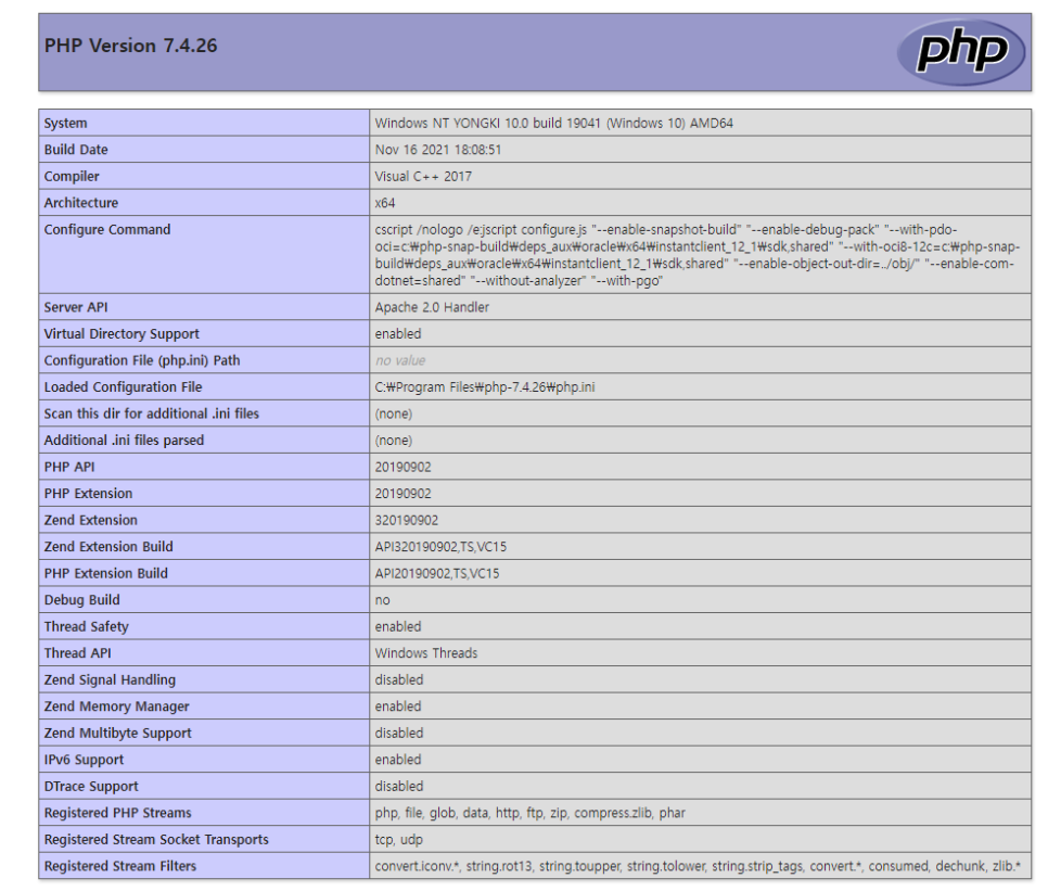 개발환경 : Window 10 64bit, Apache 2.4.51, PHP7.4 (7.4.26)