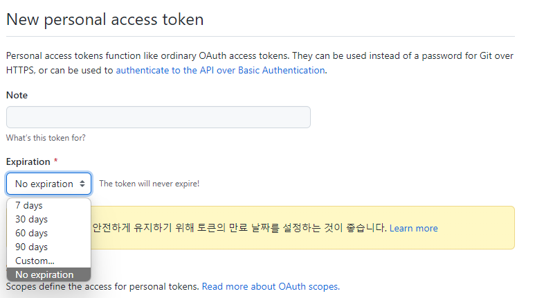 유효기간 설정하는 부분이 있는데 유효기간을 설정하게 되면 일정 기간 이후 토큰을 재설정 하라는 메일과 함께 재설정의 귀찮음이 있다. 필자도 이것 때문에 갑자기 git이 인증 오류가 발생해 인증 재설정 하면서 글을 작성하는 중이다.